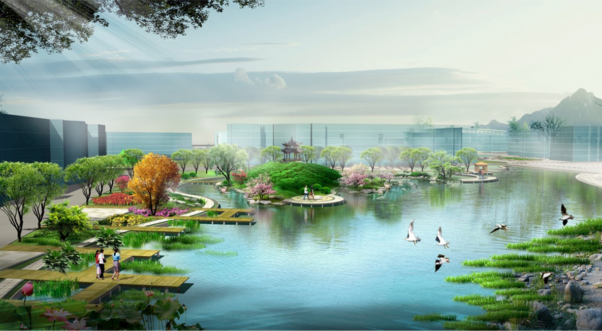 根據對場地的分析與設計理念的綜合考慮,形成“一山一水”的理念,以“三道一環(huán),五個景點、七個功能分區(qū)”為特色的景觀構架(南為文正湖,北為裕澤湖)。