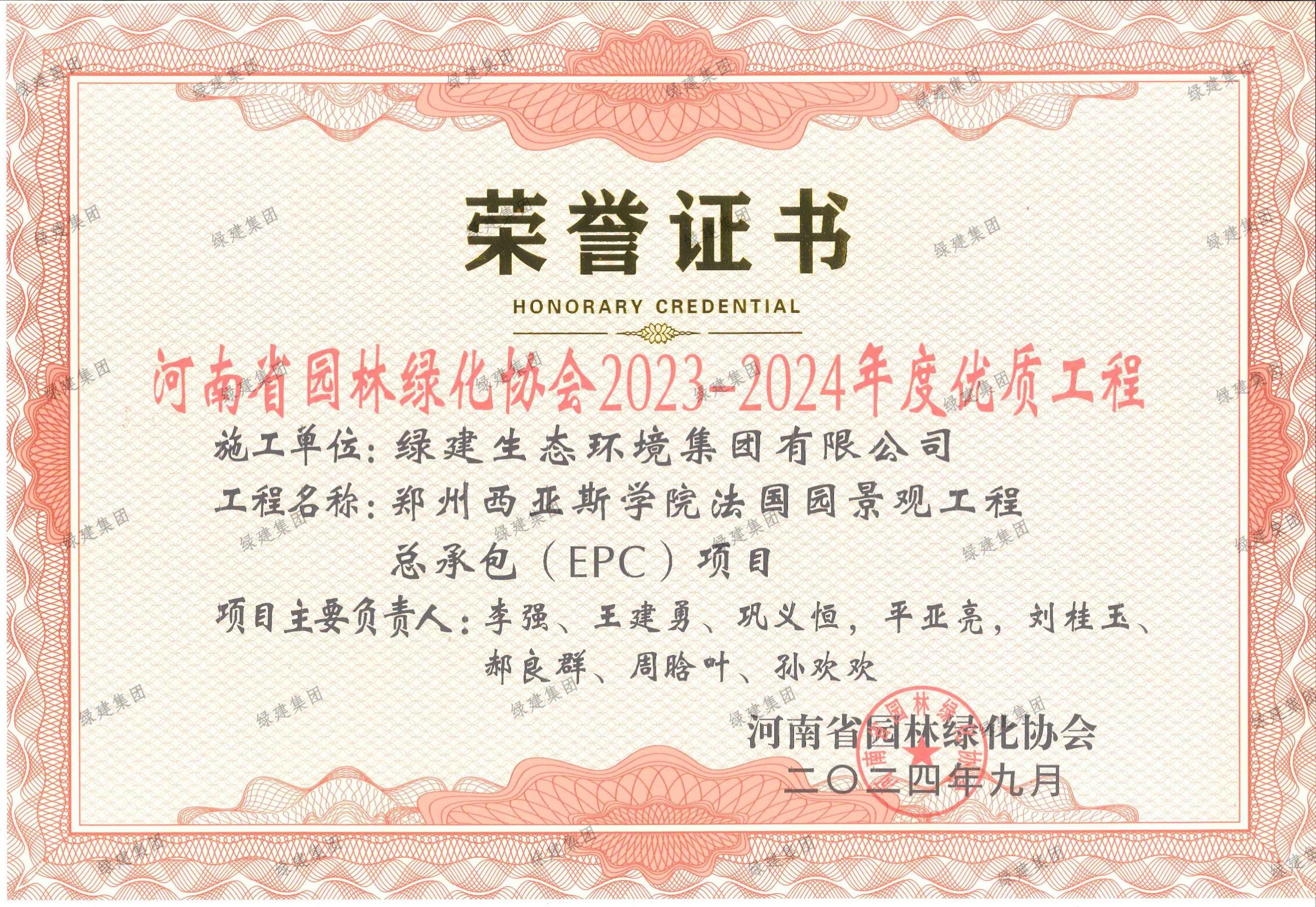 河南省園林綠化協會2023-2024年度優質工程獎